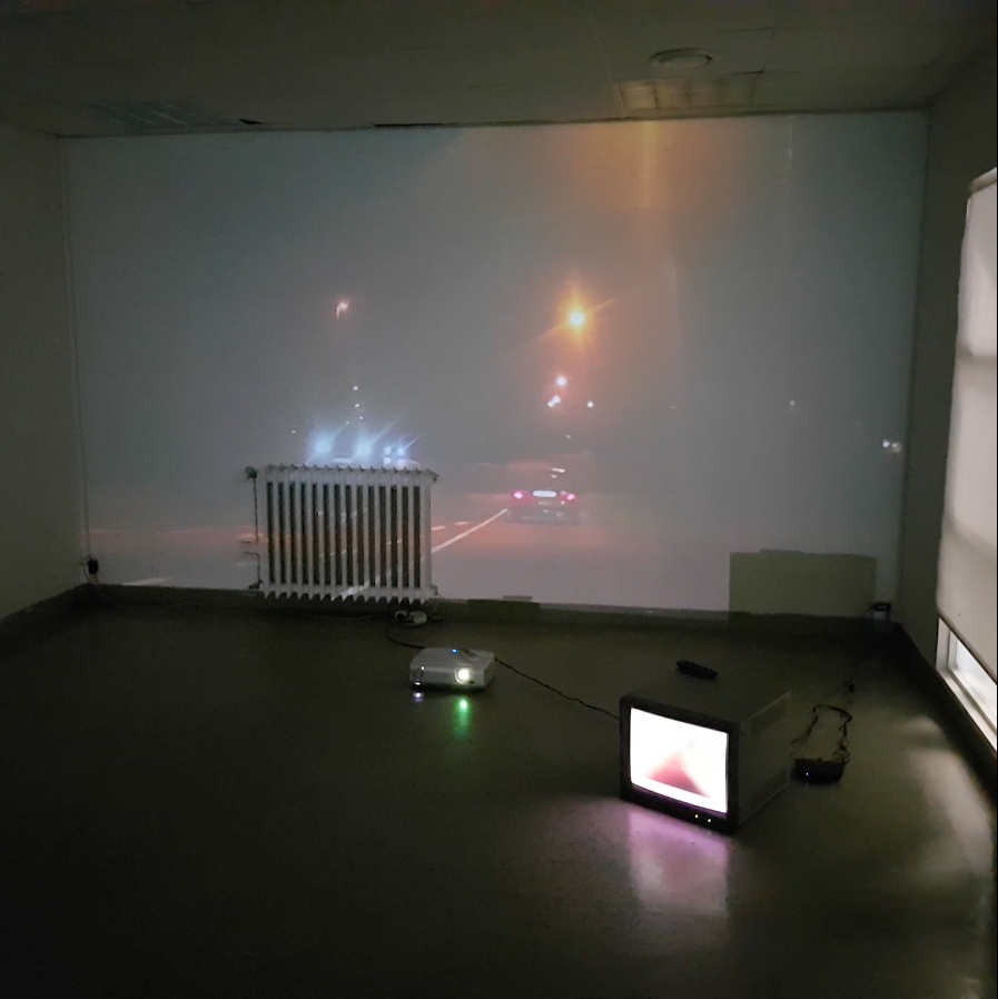 This was a test for an exhibition. It had 2 big projections and 2 videos. One projection showed an infinite loop of a man sitting on grass, pondering about life. The other projection was a dashcam from a car ride. The 2 videos were various, abstract shots from daily life.